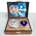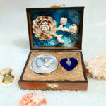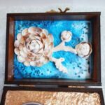 مروارید را از صدف خارج کرده و درون گردنبند موجود در جعبه قرار داده.